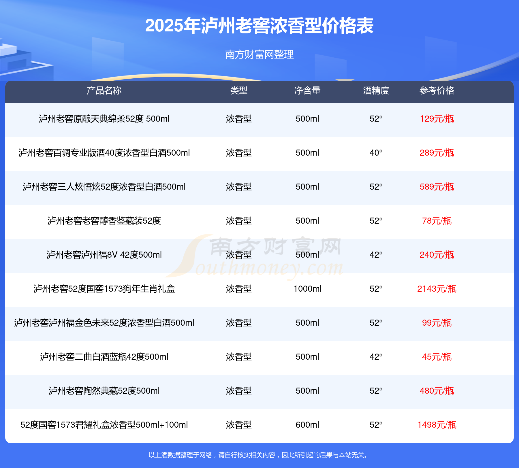 2025年,泸州老窖国窖1573春酿鼠兆丰年E 55度、泸州老窖国窖1573生命中的那坛酒55度014、泸州老窖国窖1573春酿鼠兆丰年A 55度、泸州老窖国窖1573生命中的那坛酒55度013浓香型白酒1000ml、泸州老窖国窖1573生命中的那坛酒55度009 1000ml、泸州老窖国窖1573中国品味52度浓香型白酒500ml、泸州老窖国窖1573许燎源概念作品58度浓香型白酒1000ml等泸州老窖浓香型酒参考价格如下:泸州老窖国窖1573春酿鼠兆丰年E 55度参考价17999元、泸州老窖国窖1573生命中的那坛酒55度014参考价9999元、泸州老窖国窖1573春酿鼠兆丰年A 55度参考价5088元、泸州老窖国窖1573生命中的那坛酒55度013浓香型白酒1000ml参考价4988元、泸州老窖国窖1573生命中的那坛酒55度009 1000ml参考价4288元、泸州老窖国窖1573中国品味52度浓香型白酒500ml参考价2888元、泸州老窖国窖1573许燎源概念作品58度浓香型白酒1000ml参考价2680元。