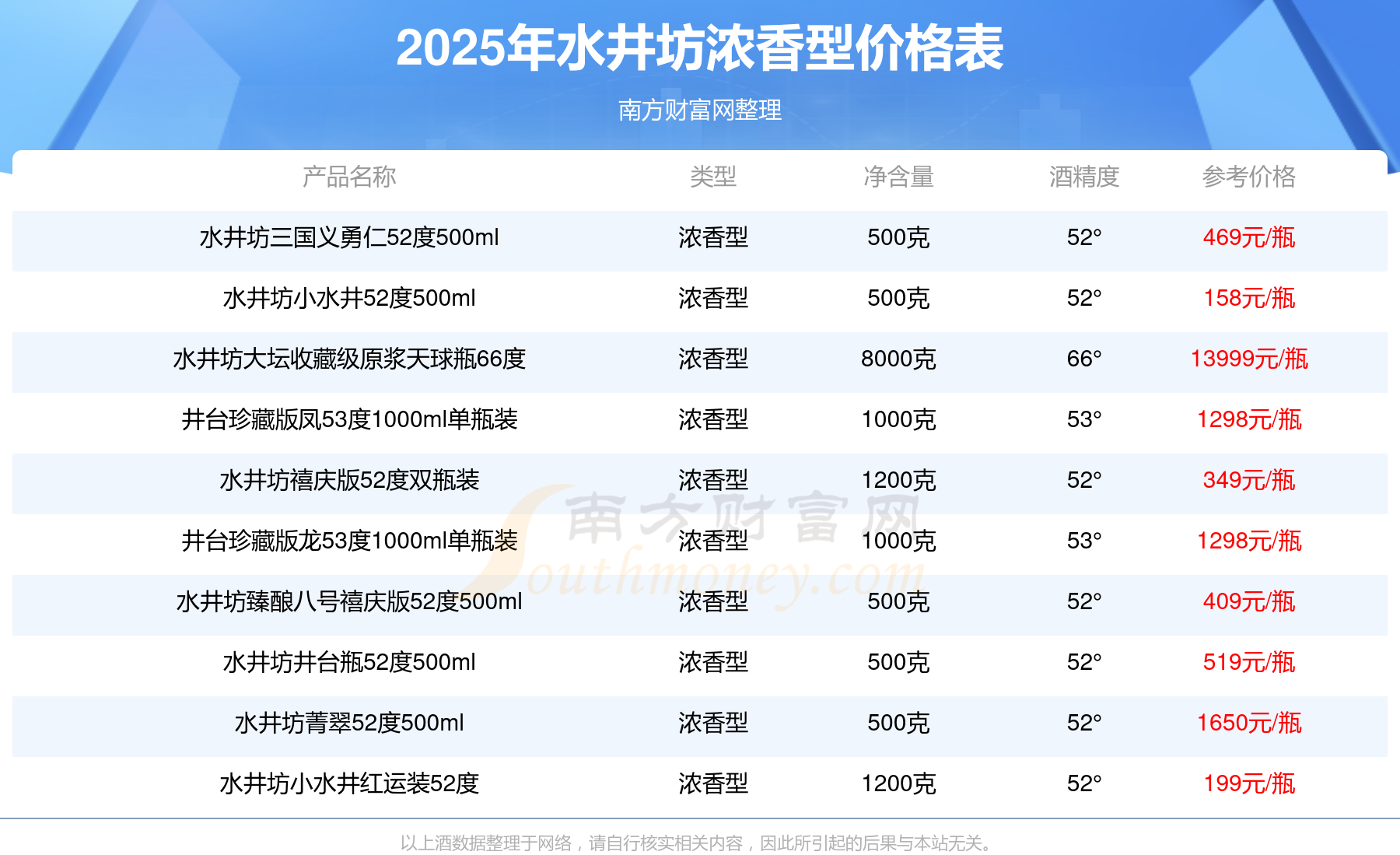 水井坊浓香型酒最新价格2025:水井坊大坛收藏级原浆天球瓶66度参考价13999元/瓶、水井坊博物馆壹号53度双瓶装参考价10988元/瓶、53°水井坊公元十三600ml参考价2580元/瓶、水井坊梅兰竹菊52度浓香型600ml4瓶参考价1999元/瓶、水井坊菁翠52度500ml参考价1650元/瓶。