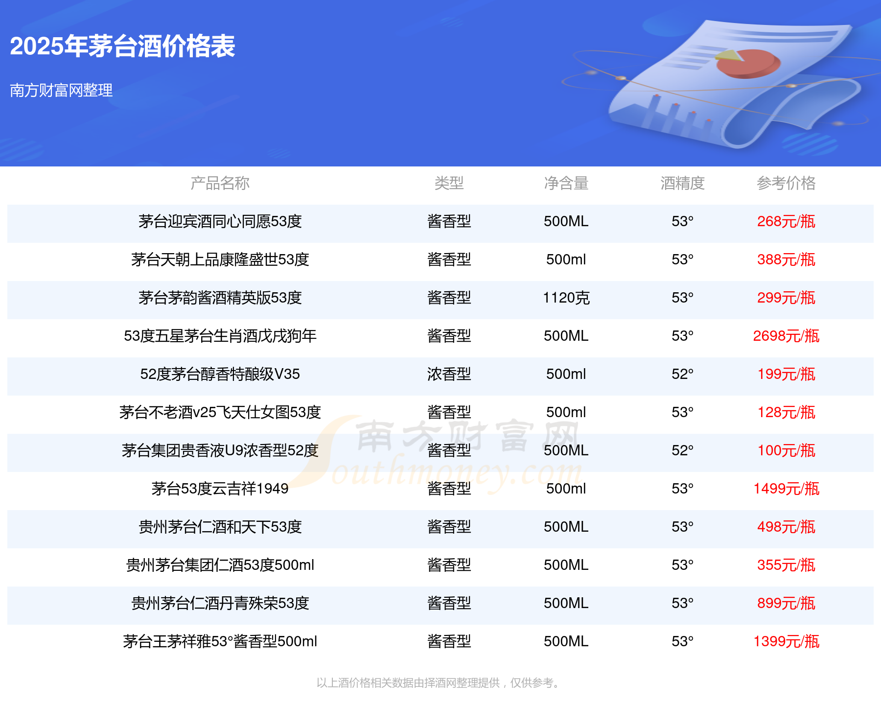 2025年,华茅鉴藏 酱香型白酒 3L 53°、53度五星茅台生肖酒丁酉鸡年、贵州茅台己亥猪年生肖酒53°500ml、53度五星茅台生肖酒戊戌狗年、飞天茅台53°500ml(2015年)、茅台王子酒己亥猪年生肖纪念酒53度2.5L、茅台1935酱香型53度、茅台财富贵宾典藏酒53度等茅台酒价格如下:华茅鉴藏 酱香型白酒 3L 53°参考价8388元/瓶、53度五星茅台生肖酒丁酉鸡年参考价2798元/瓶、贵州茅台己亥猪年生肖酒53°500ml参考价2699元/瓶、53度五星茅台生肖酒戊戌狗年参考价2698元/瓶、飞天茅台53°500ml(2015年)参考价2199元/瓶、茅台王子酒己亥猪年生肖纪念酒53度2.5L参考价2099元/瓶、茅台1935酱香型53度参考价1799元/瓶、茅台财富贵宾典藏酒53度参考价1599元/瓶。