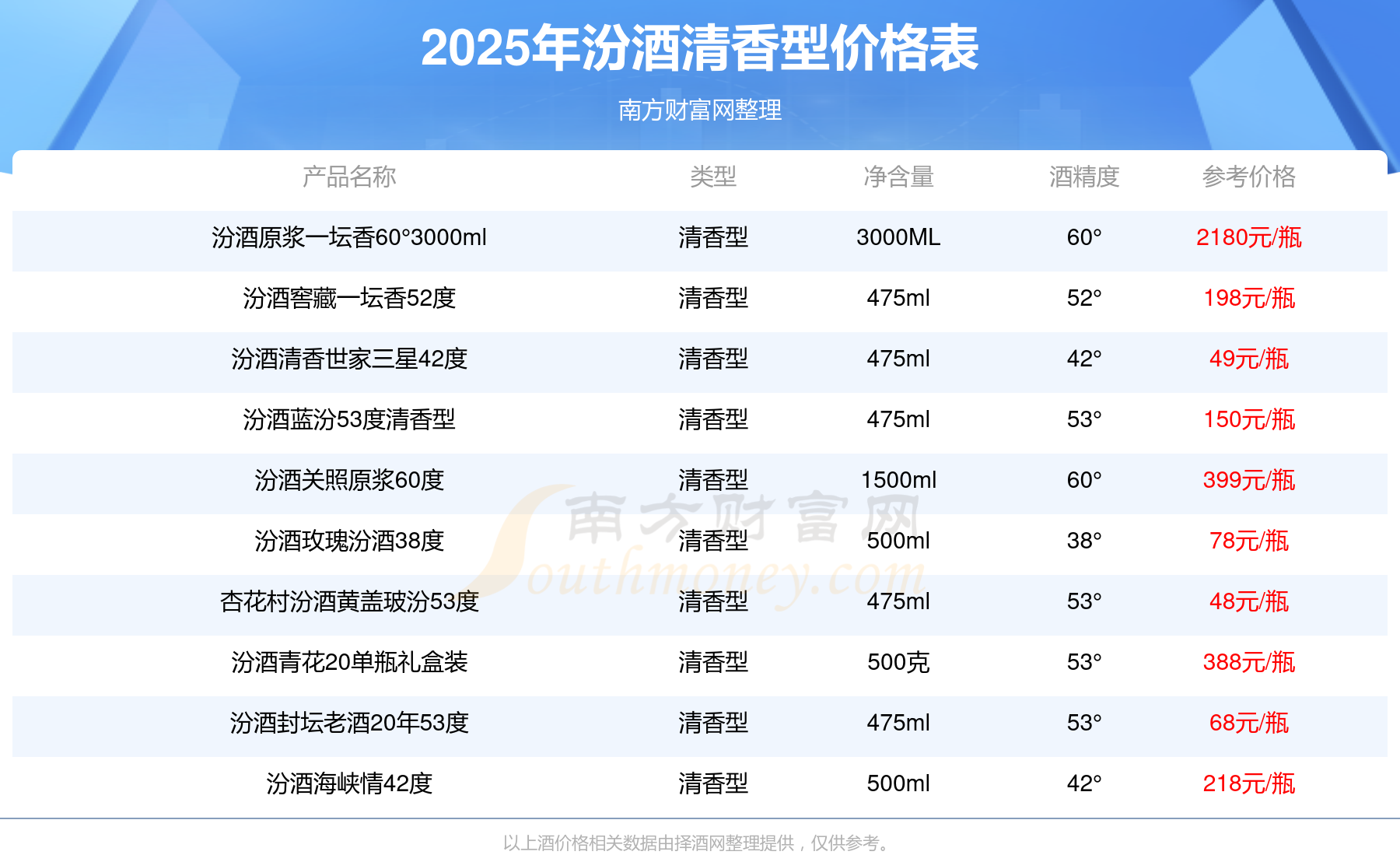 汾酒原浆一坛香60°3000ml参考价2180元/瓶、汾酒原浆一坛香60°1500ml参考价1536元/瓶、42度汾酒青花25参考价598元/瓶、汾酒收藏系列盘古汾酒55度参考价400元/瓶、汾酒关照原浆60度参考价399元/瓶、汾酒青花20单瓶礼盒装参考价388元/瓶、汾酒海峡情42度参考价218元/瓶。