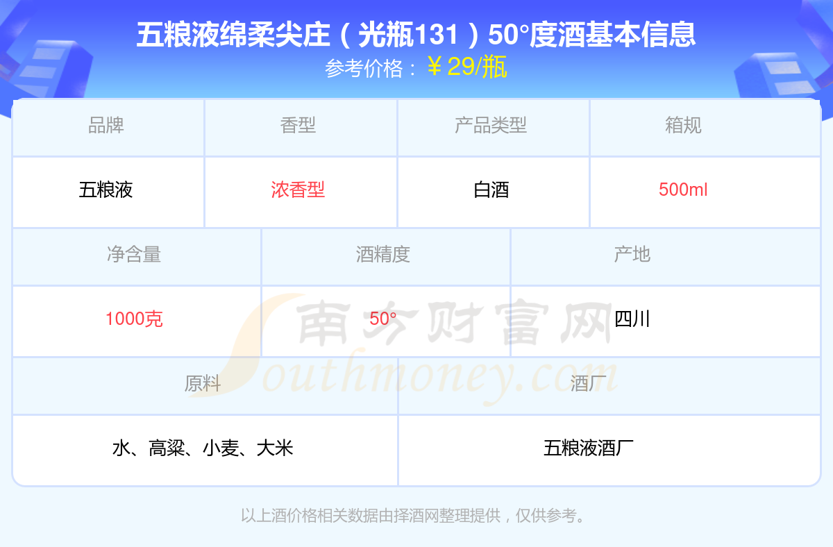 五粮液绵柔尖庄(光瓶131)50°度基本信息