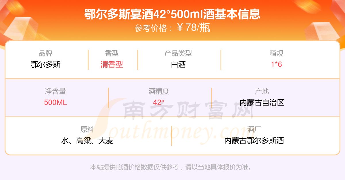 “鄂尔多斯”粮食白酒创牌于1953年,至今已走过近60年的风雨历程。企业通过ISO-9001国际质量体系认证。“鄂尔多斯”白酒商标为中国驰名商标、内蒙古老字号。目前,公司年白酒生产能力达2万吨,有清、浓、兼三大香型,高、中、低不同档次和度数近百余种产品。内蒙古鄂尔多斯酒业集团有限公司一直采用固态纯粮酿造,选料考究,工艺先进,自然老熟,具有酒香醇正,柔和清爽,绵甜淡雅,追求健康的独特风格,产品深受消费者欢迎,畅销区内外。