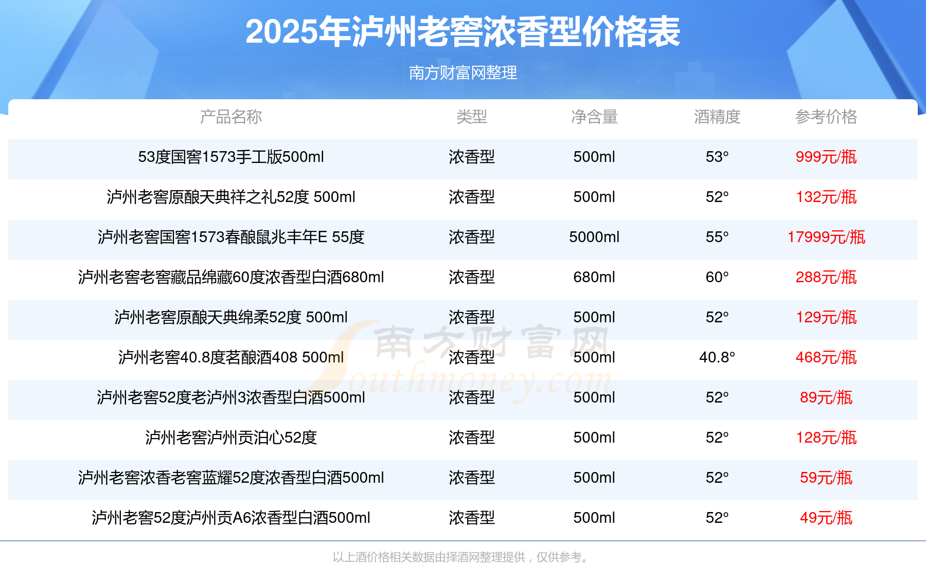 泸州老窖浓香型酒最新价格2025:泸州老窖国窖1573春酿鼠兆丰年E 55度参考价17999元/瓶、泸州老窖国窖1573生命中的那坛酒55度014参考价9999元/瓶、泸州老窖国窖1573春酿鼠兆丰年A 55度参考价5088元/瓶、泸州老窖国窖1573生命中的那坛酒55度013浓香型白酒1000ml参考价4988元/瓶。