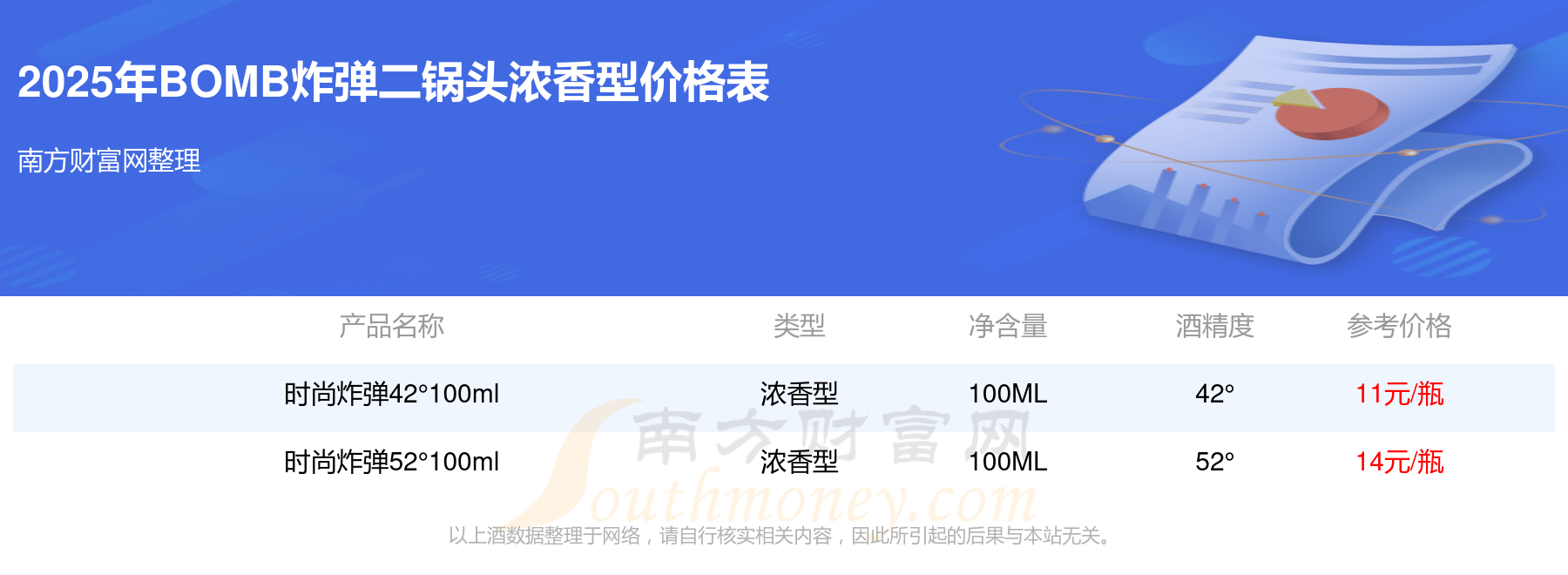 BOMB炸弹二锅头浓香型酒最新价格2025:时尚炸弹52°100ml参考价14元/瓶、时尚炸弹42°100ml参考价11元/瓶。
