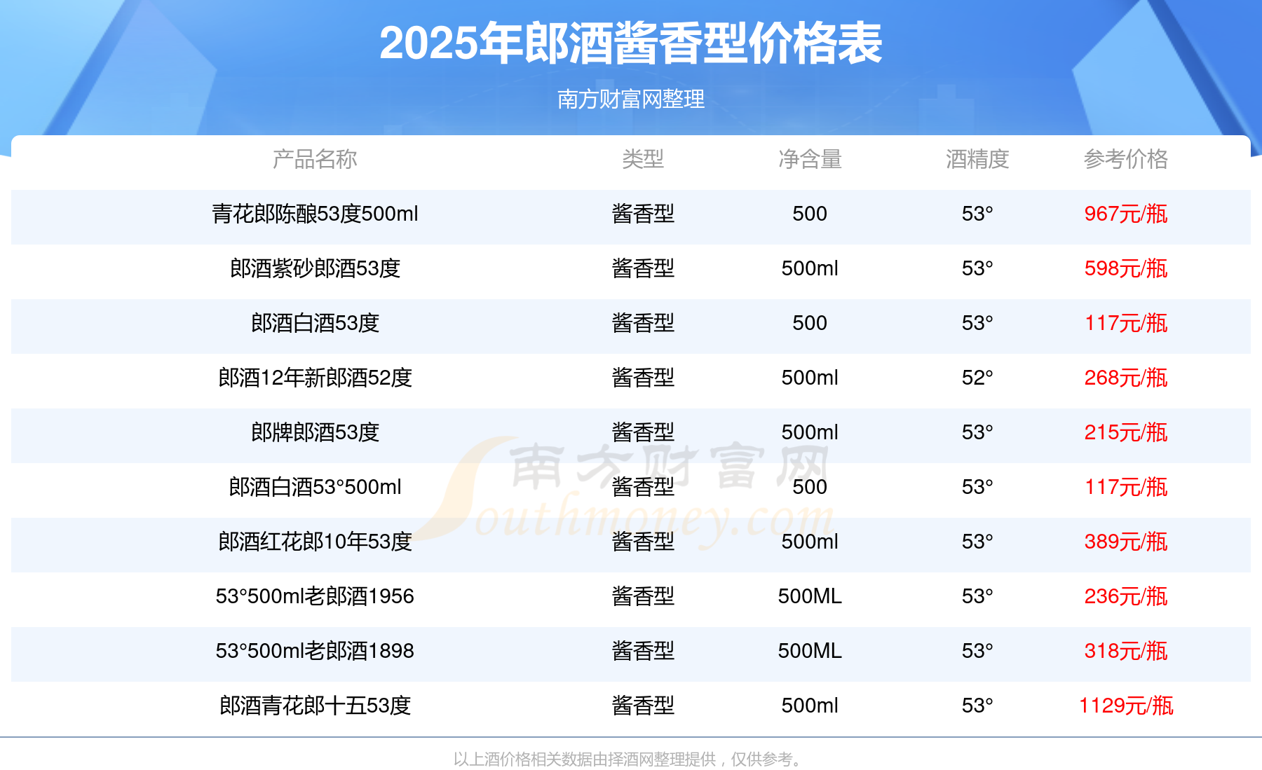 郎酒青花郎十五53度参考价1129元/瓶、青花郎陈酿53度500ml参考价967元/瓶、郎酒紫砂郎酒53度参考价598元/瓶、郎酒红花郎10年53度参考价389元/瓶、53°500ml老郎酒1898参考价318元/瓶、郎酒12年新郎酒52度参考价268元/瓶、53°500ml老郎酒1956参考价236元/瓶、郎牌郎酒53度参考价215元/瓶。