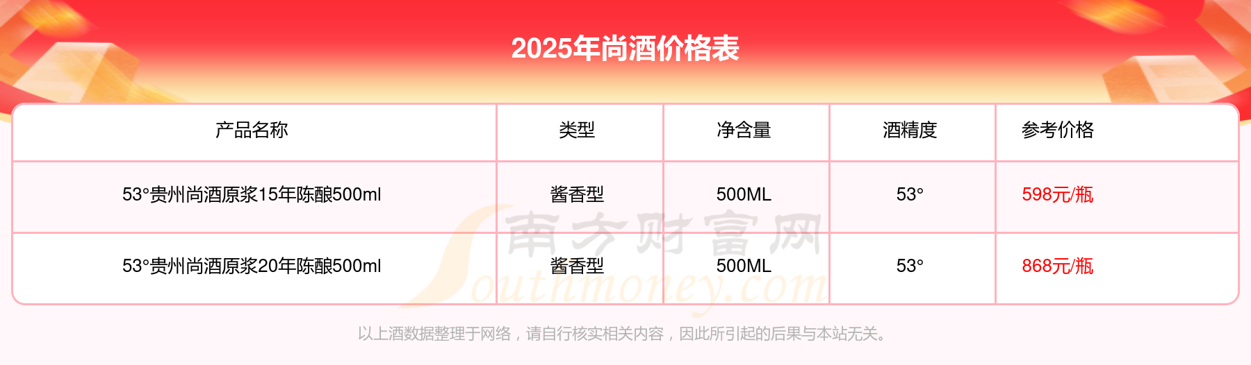 53°贵州尚酒原浆20年陈酿500ml参考价868元/瓶、53°贵州尚酒原浆15年陈酿500ml参考价598元/瓶。