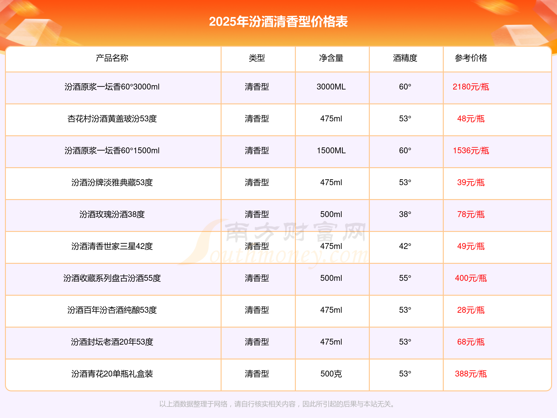2025汾酒清香型酒最新价格:汾酒原浆一坛香60°3000ml参考价2180元/瓶、汾酒原浆一坛香60°1500ml参考价1536元/瓶、42度汾酒青花25参考价598元/瓶、汾酒收藏系列盘古汾酒55度参考价400元/瓶、汾酒关照原浆60度参考价399元/瓶、汾酒青花20单瓶礼盒装参考价388元/瓶。