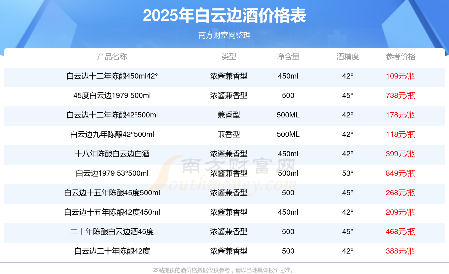 2025年,白云边1979 53°500ml、45度白云边1979 500ml、二十年陈酿白云边酒45度、十八年陈酿白云边白酒、白云边二十年陈酿42度等白云边酒价格如下:白云边1979 53°500ml参考价849元/瓶、45度白云边1979 500ml参考价738元/瓶、二十年陈酿白云边酒45度参考价468元/瓶、十八年陈酿白云边白酒参考价399元/瓶、白云边二十年陈酿42度参考价388元/瓶。