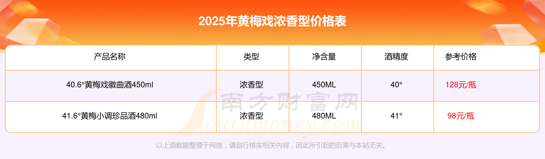 黄梅戏浓香型酒最新价格2025:40.6°黄梅戏徽曲酒450ml参考价128元/瓶、41.6°黄梅小调珍品酒480ml参考价98元/瓶。