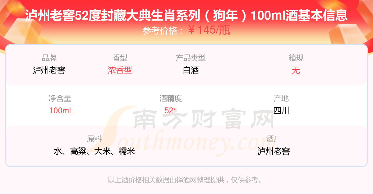 泸州老窖52度封藏大典生肖系列(狗年)100ml基本信息