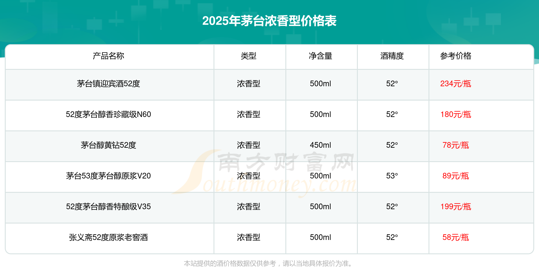 2025年茅台浓香型酒茅台镇迎宾酒52度、52度茅台醇香特酿级V35、52度茅台醇香珍藏级N60、茅台53度茅台醇原浆V20等最新价格如下: