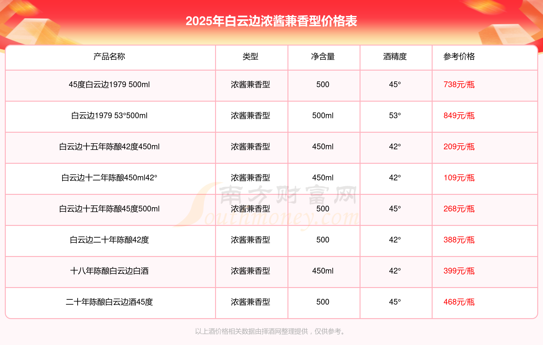 白云边浓酱兼香型酒最新价格2025:白云边1979 53°500ml参考价849元/瓶、45度白云边1979 500ml参考价738元/瓶、二十年陈酿白云边酒45度参考价468元/瓶、十八年陈酿白云边白酒参考价399元/瓶、白云边二十年陈酿42度参考价388元/瓶。
