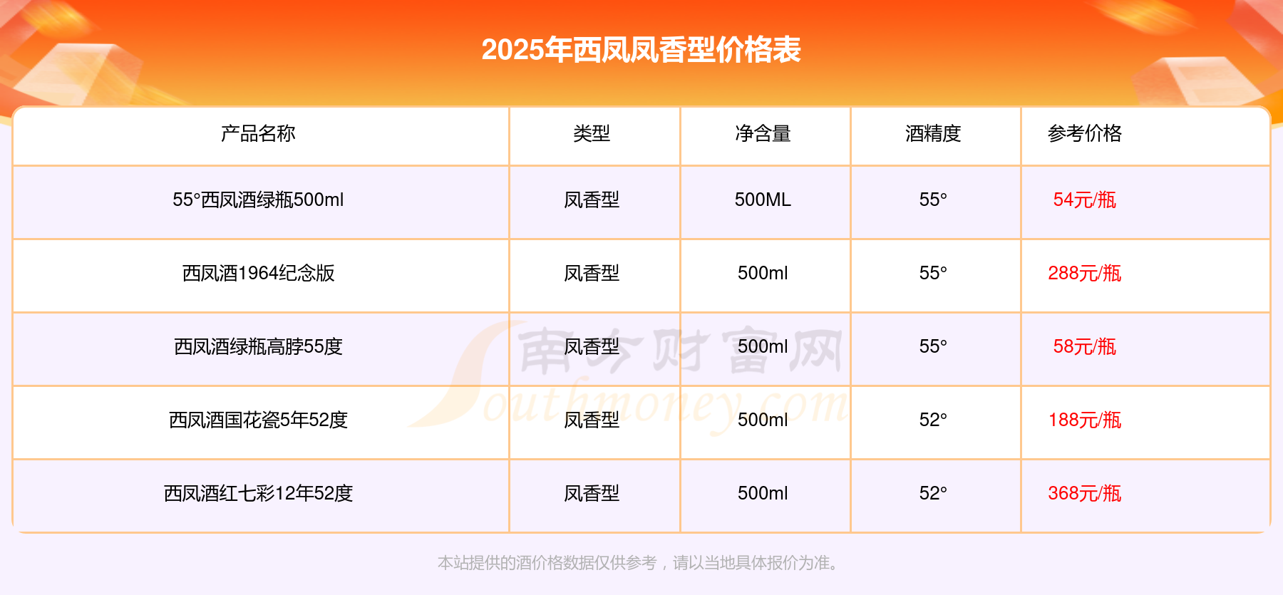 2025年西凤凤香型价格最高的酒是西凤酒红七彩12年52度,参考价368元/瓶,最低的是55°西凤酒绿瓶500ml,参考价54元/瓶,价格高低差为314元/瓶。