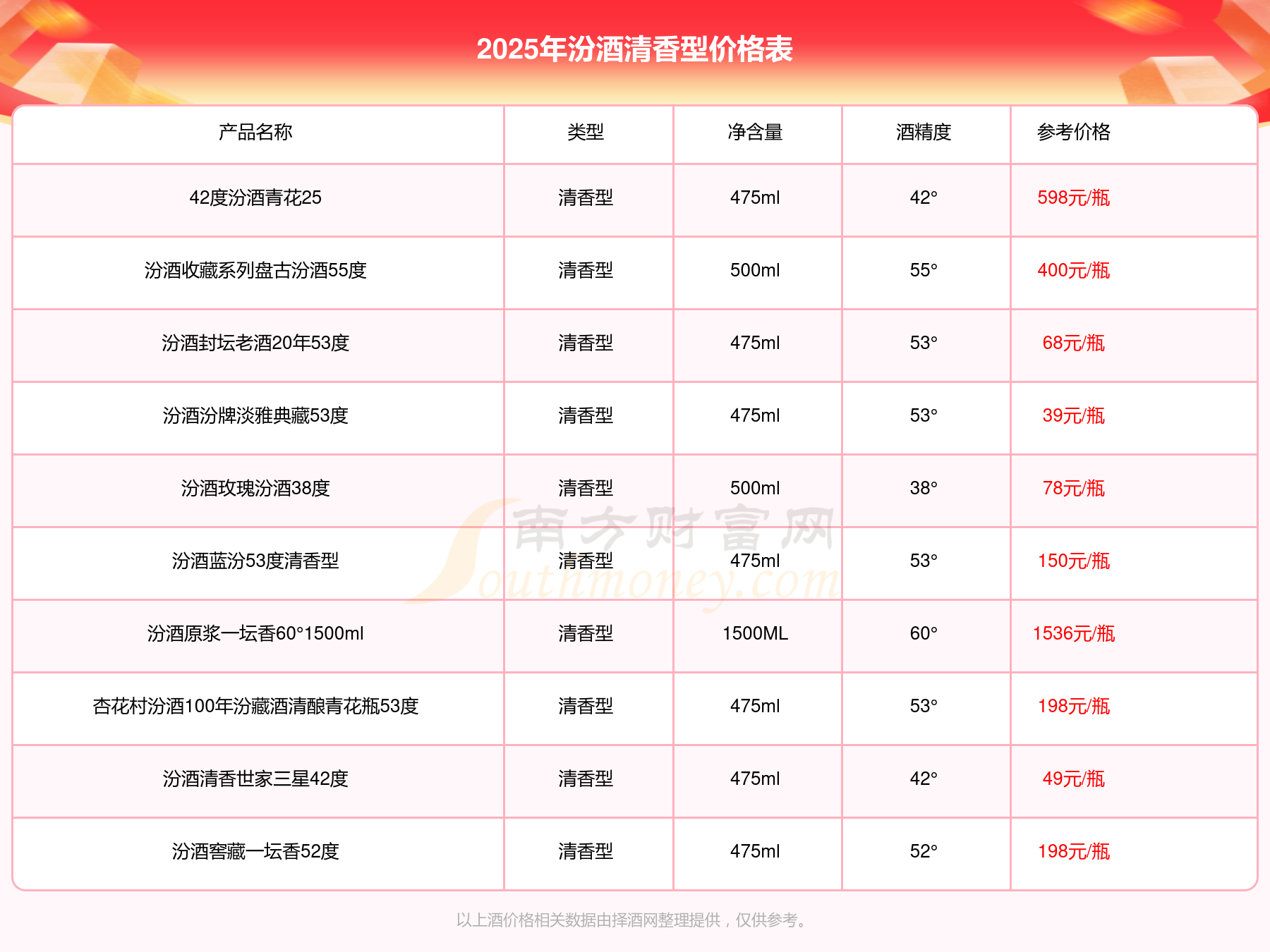 2025汾酒清香型酒最新价格:汾酒原浆一坛香60°3000ml参考价2180元/瓶、汾酒原浆一坛香60°1500ml参考价1536元/瓶、42度汾酒青花25参考价598元/瓶、汾酒收藏系列盘古汾酒55度参考价400元/瓶、汾酒关照原浆60度参考价399元/瓶。