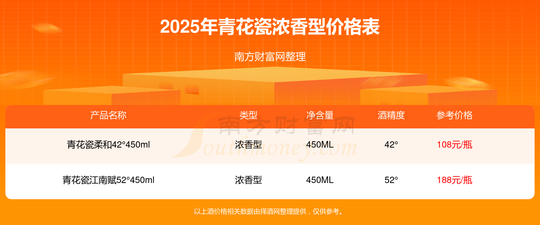 青花瓷江南赋52°450ml参考价188元/瓶、青花瓷柔和42°450ml参考价108元/瓶。