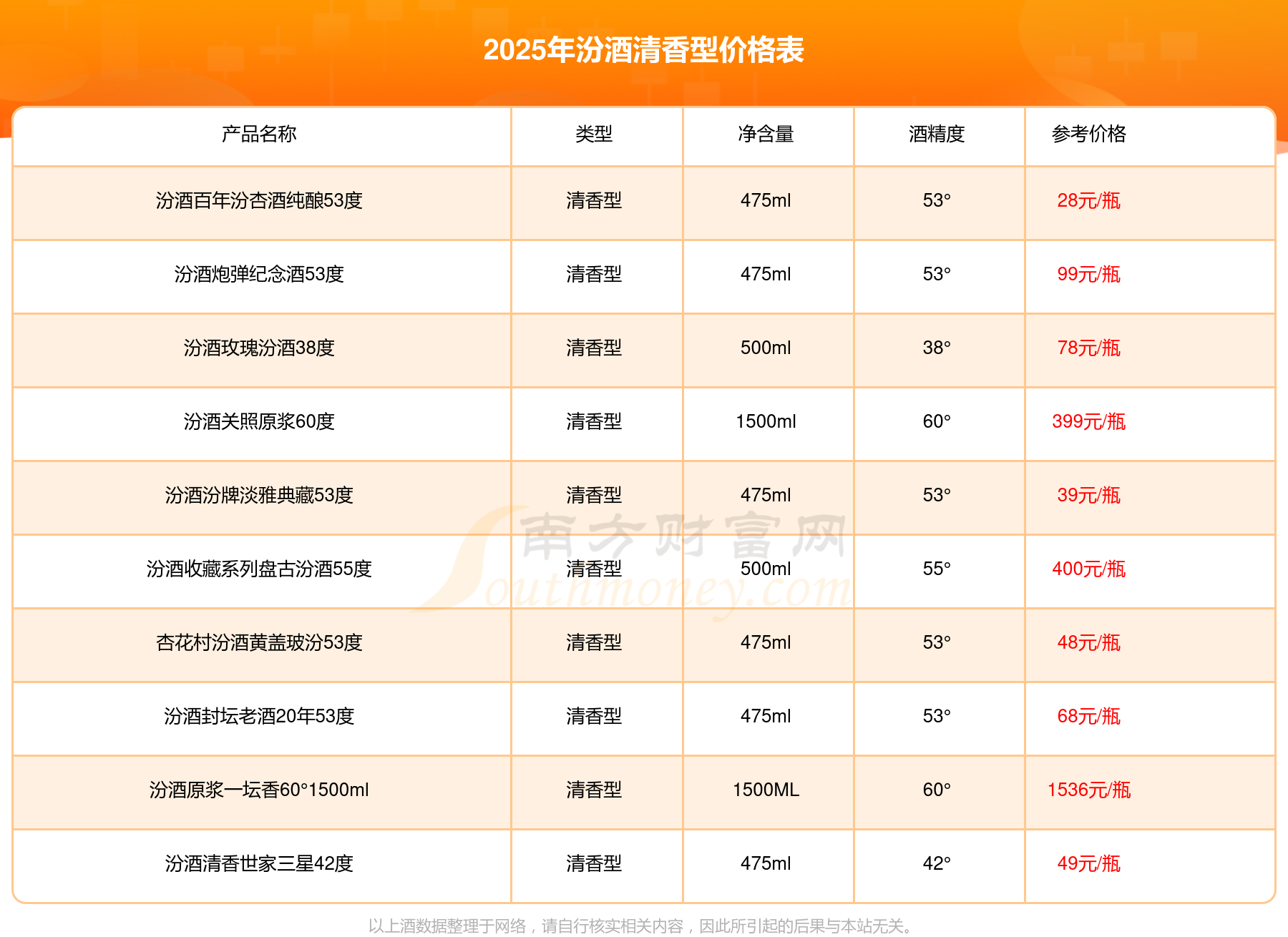 2025年,汾酒清香型酒价格最高的是汾酒原浆一坛香60°3000ml,参考价2180元,最低的是汾酒百年汾杏酒纯酿53度,参考价28元,价格高低差为2152元。