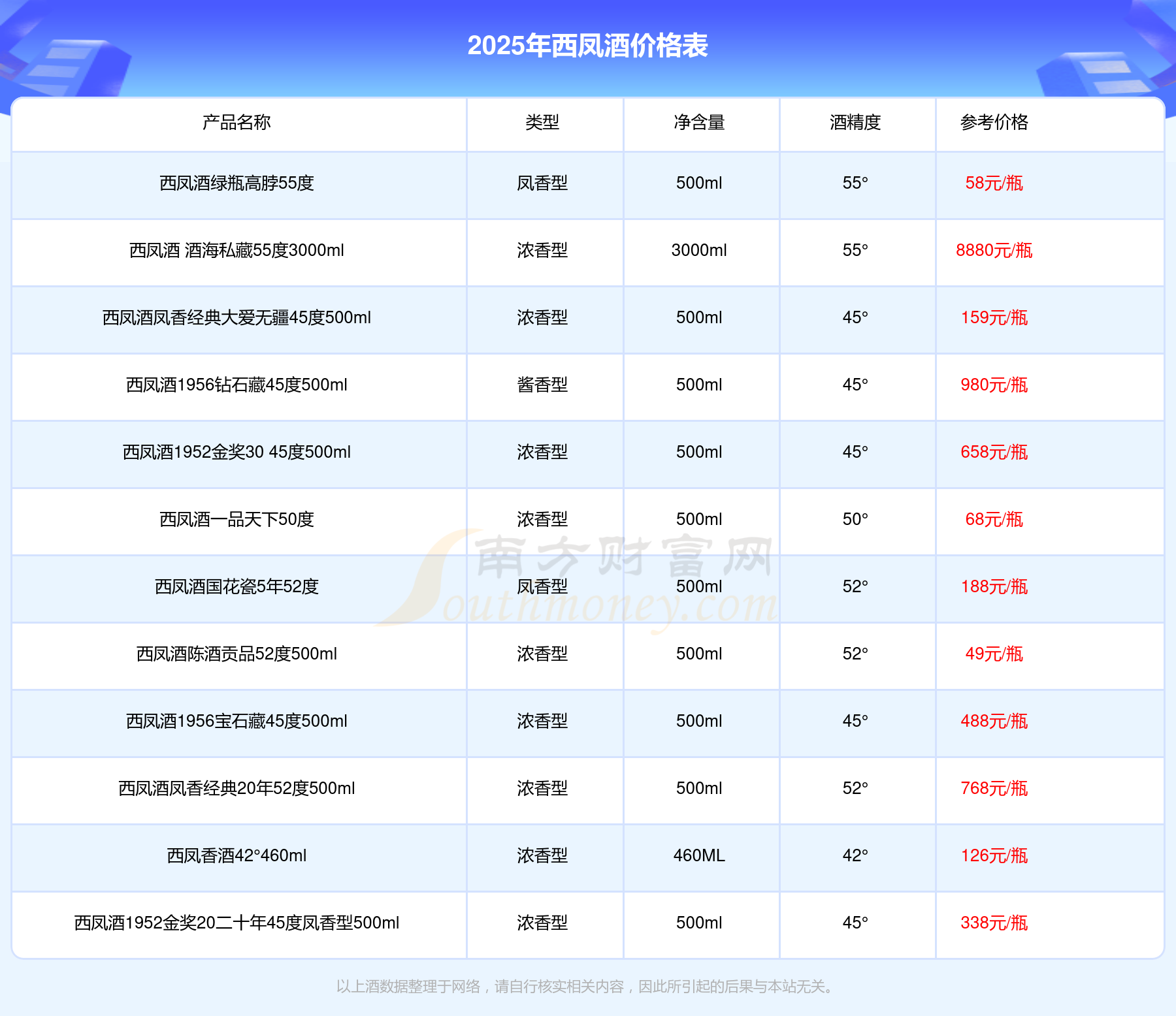 2025年西凤酒西凤酒 酒海私藏55度3000ml、西凤酒1952金奖50 55度500ml、西凤酒2013年产老酒凤香经典30年52度500ml、西凤酒1956钻石藏45度500ml、西凤酒1952金奖30 55度500ml、西凤酒凤香经典20年52度500ml等最新价格如下:西凤酒 酒海私藏55度3000ml参考价8880元/瓶、西凤酒1952金奖50 55度500ml参考价2380元/瓶、西凤酒2013年产老酒凤香经典30年52度500ml参考价1280元/瓶、西凤酒1956钻石藏45度500ml参考价980元/瓶、西凤酒1952金奖30 55度500ml参考价898元/瓶、西凤酒凤香经典20年52度500ml参考价768元/瓶。