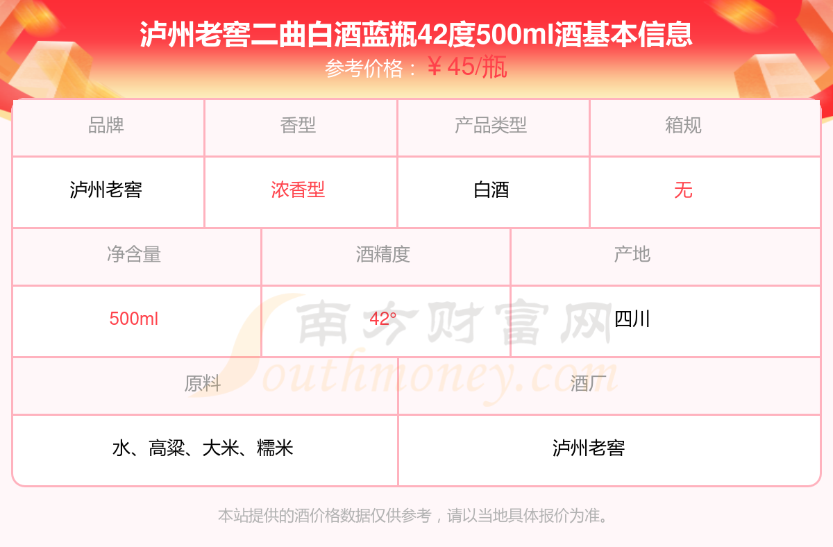 泸州老窖二曲白酒蓝瓶42度500ml基本信息