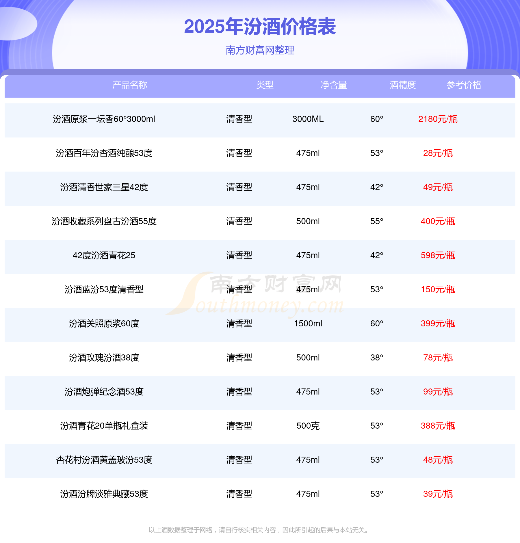 2025年汾酒汾酒原浆一坛香60°3000ml、汾酒原浆一坛香60°1500ml、42度汾酒青花25、汾酒收藏系列盘古汾酒55度、汾酒关照原浆60度等最新价格如下:汾酒原浆一坛香60°3000ml参考价2180元/瓶、汾酒原浆一坛香60°1500ml参考价1536元/瓶、42度汾酒青花25参考价598元/瓶、汾酒收藏系列盘古汾酒55度参考价400元/瓶、汾酒关照原浆60度参考价399元/瓶。