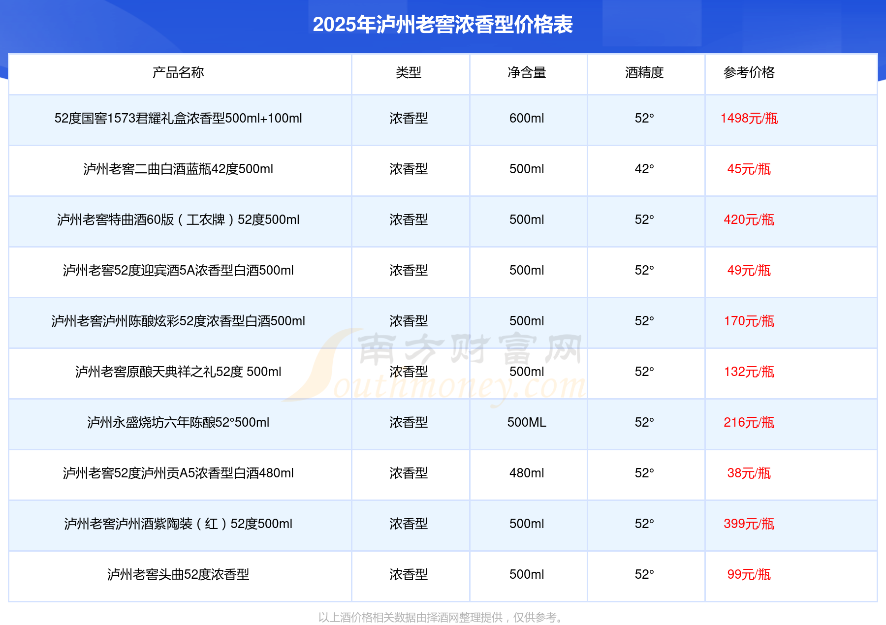 2025年泸州老窖浓香型酒泸州老窖国窖1573春酿鼠兆丰年E 55度、泸州老窖国窖1573生命中的那坛酒55度014、泸州老窖国窖1573春酿鼠兆丰年A 55度、泸州老窖国窖1573生命中的那坛酒55度013浓香型白酒1000ml、泸州老窖国窖1573生命中的那坛酒55度009 1000ml、泸州老窖国窖1573中国品味52度浓香型白酒500ml、泸州老窖国窖1573许燎源概念作品58度浓香型白酒1000ml等最新价格如下:泸州老窖国窖1573春酿鼠兆丰年E 55度参考价17999元/瓶、泸州老窖国窖1573生命中的那坛酒55度014参考价9999元/瓶、泸州老窖国窖1573春酿鼠兆丰年A 55度参考价5088元/瓶、泸州老窖国窖1573生命中的那坛酒55度013浓香型白酒1000ml参考价4988元/瓶、泸州老窖国窖1573生命中的那坛酒55度009 1000ml参考价4288元/瓶、泸州老窖国窖1573中国品味52度浓香型白酒500ml参考价2888元/瓶、泸州老窖国窖1573许燎源概念作品58度浓香型白酒1000ml参考价2680元/瓶。