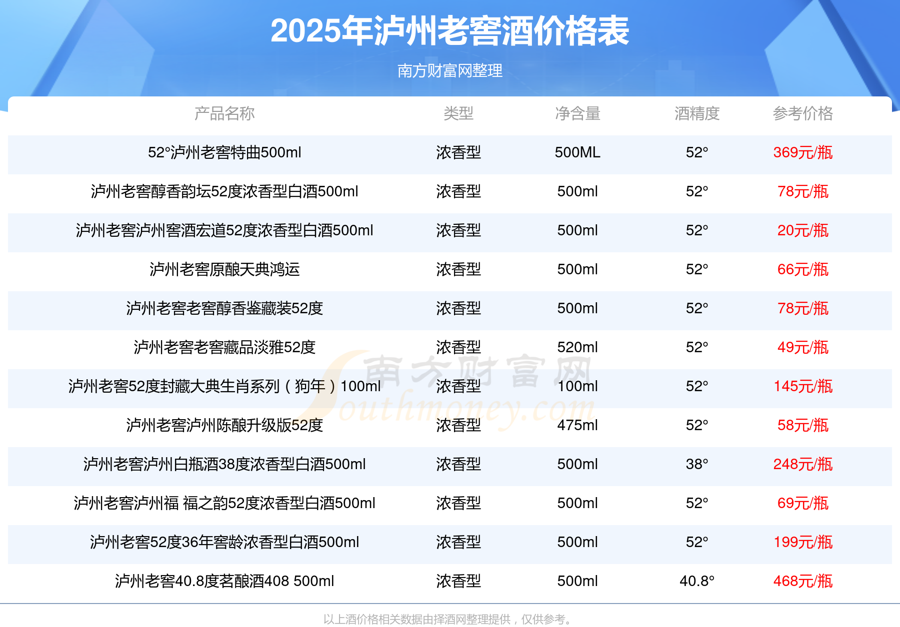泸州老窖酒最新价格2025:泸州老窖国窖1573春酿鼠兆丰年E 55度参考价17999元/瓶、泸州老窖国窖1573生命中的那坛酒55度014参考价9999元/瓶、泸州老窖国窖1573春酿鼠兆丰年A 55度参考价5088元/瓶、泸州老窖国窖1573生命中的那坛酒55度013浓香型白酒1000ml参考价4988元/瓶、泸州老窖国窖1573生命中的那坛酒55度009 1000ml参考价4288元/瓶、泸州老窖国窖1573中国品味52度浓香型白酒500ml参考价2888元/瓶、泸州老窖国窖1573许燎源概念作品58度浓香型白酒1000ml参考价2680元/瓶。