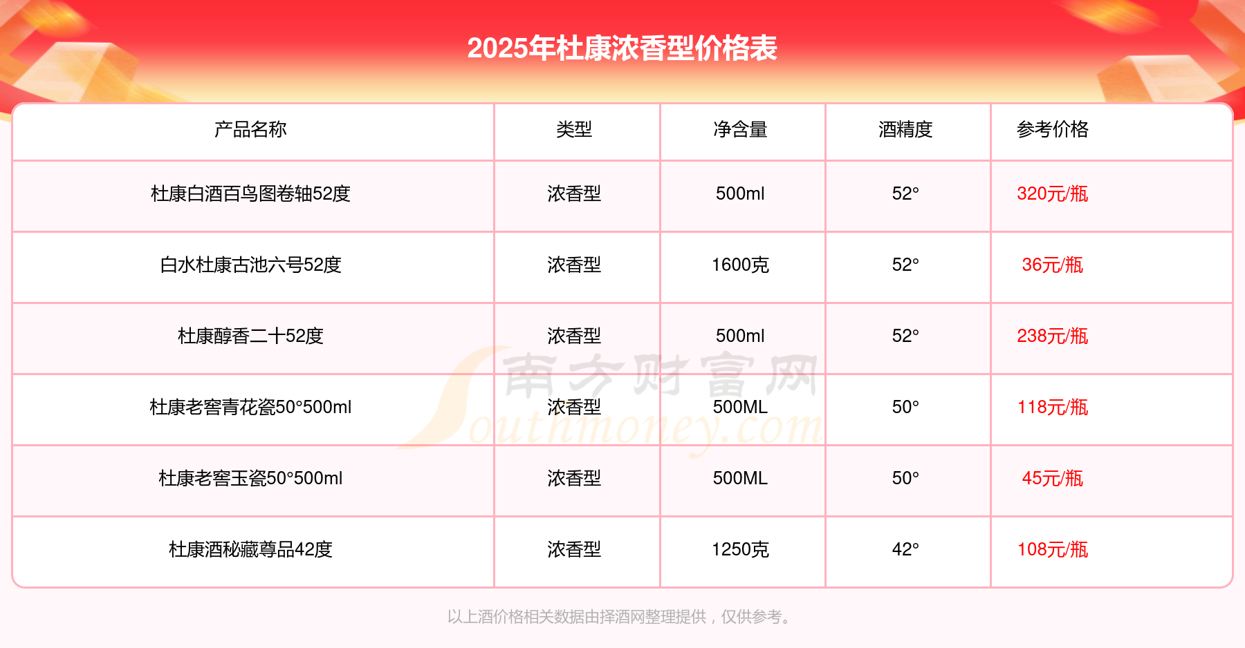 2025杜康浓香型酒最新价格:杜康白酒百鸟图卷轴52度参考价320元/瓶、杜康醇香二十52度参考价238元/瓶、杜康老窖青花瓷50°500ml参考价118元/瓶、杜康酒秘藏尊品42度参考价108元/瓶、杜康老窖玉瓷50°500ml参考价45元/瓶、白水杜康古池六号52度参考价36元/瓶。