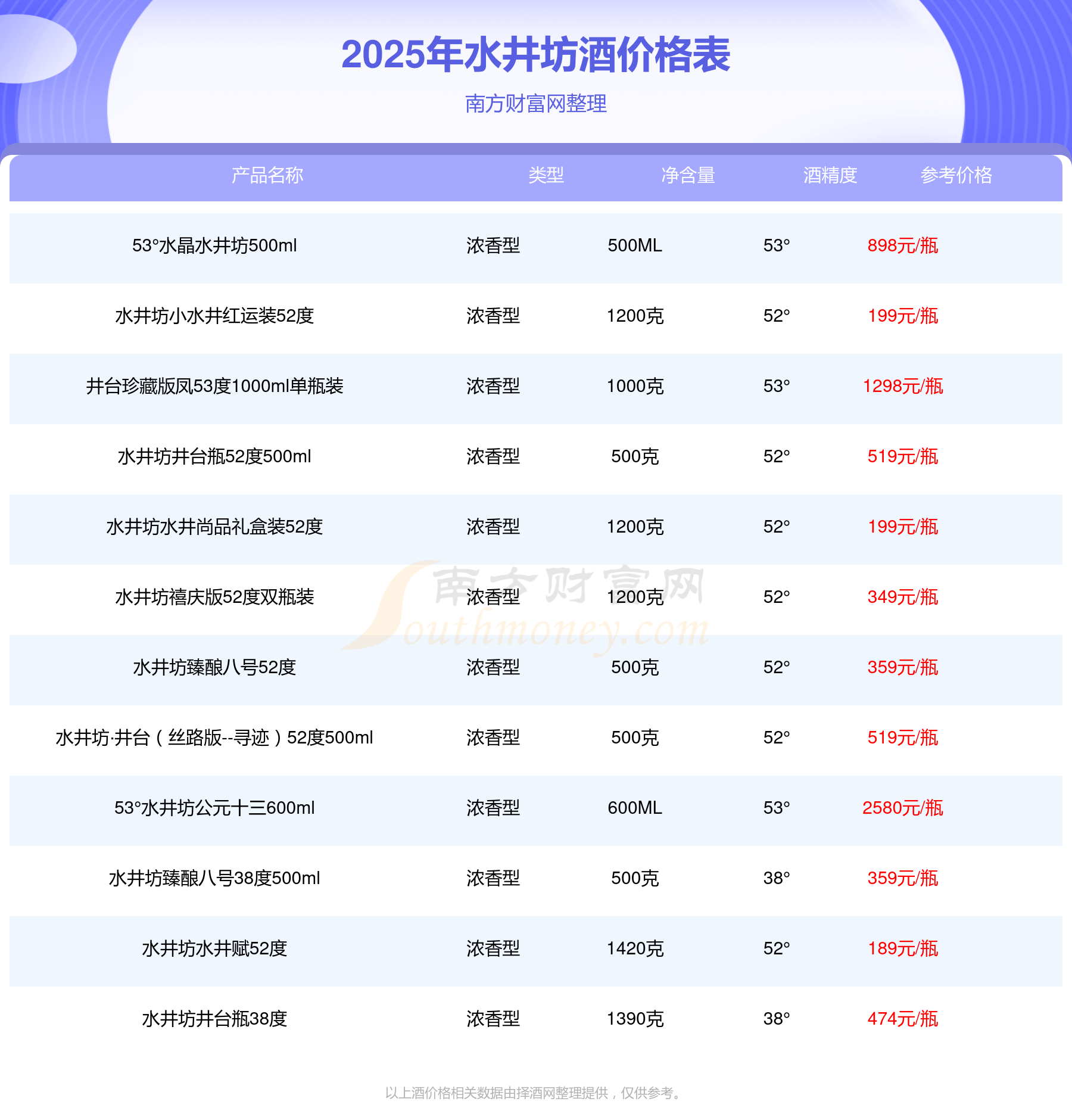 2025年,水井坊大坛收藏级原浆天球瓶66度、水井坊博物馆壹号53度双瓶装、53°水井坊公元十三600ml等水井坊酒价格如下:水井坊大坛收藏级原浆天球瓶66度参考价13999元/瓶、水井坊博物馆壹号53度双瓶装参考价10988元/瓶、53°水井坊公元十三600ml参考价2580元/瓶。