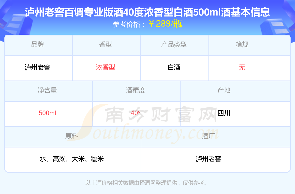 泸州老窖百调专业版酒40度浓香型白酒500ml基本信息