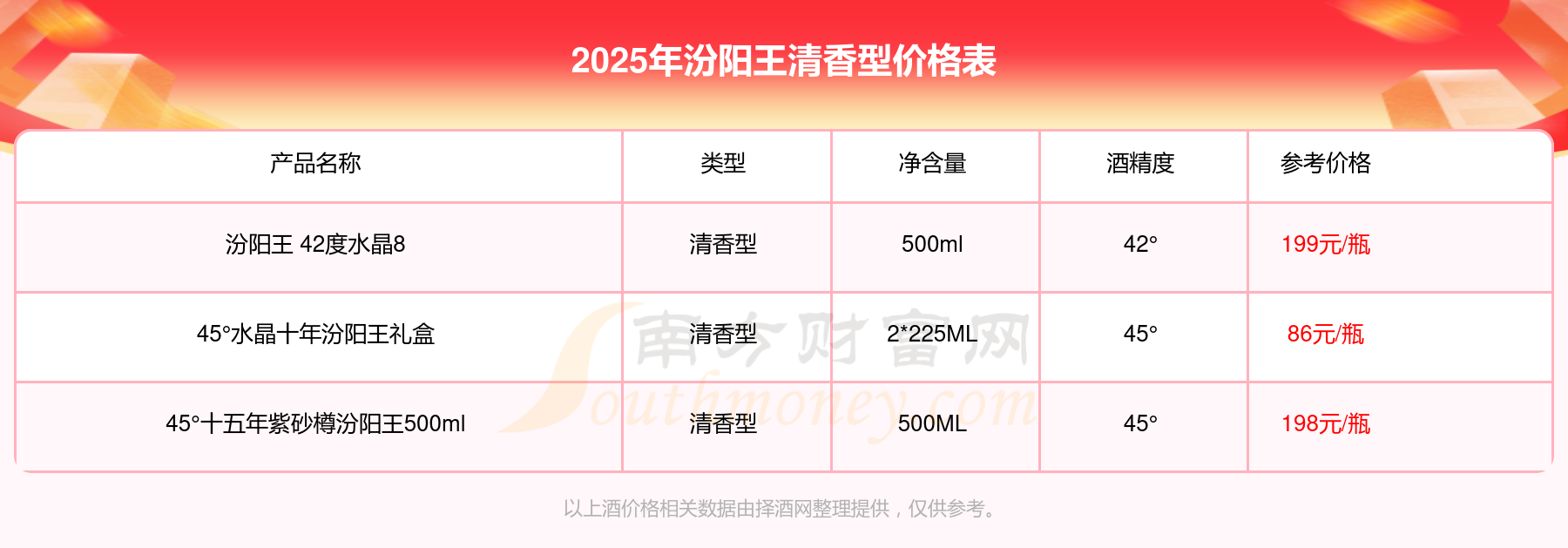 2025年汾阳王清香型酒汾阳王 42度水晶8、45°十五年紫砂樽汾阳王500ml、45°水晶十年汾阳王礼盒等最新价格如下:汾阳王 42度水晶8参考价199元/瓶、45°十五年紫砂樽汾阳王500ml参考价198元/瓶、45°水晶十年汾阳王礼盒参考价86元/瓶。