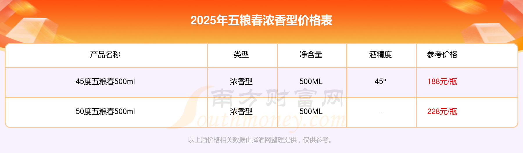 50度五粮春500ml参考价228元/瓶、45度五粮春500ml参考价188元/瓶。