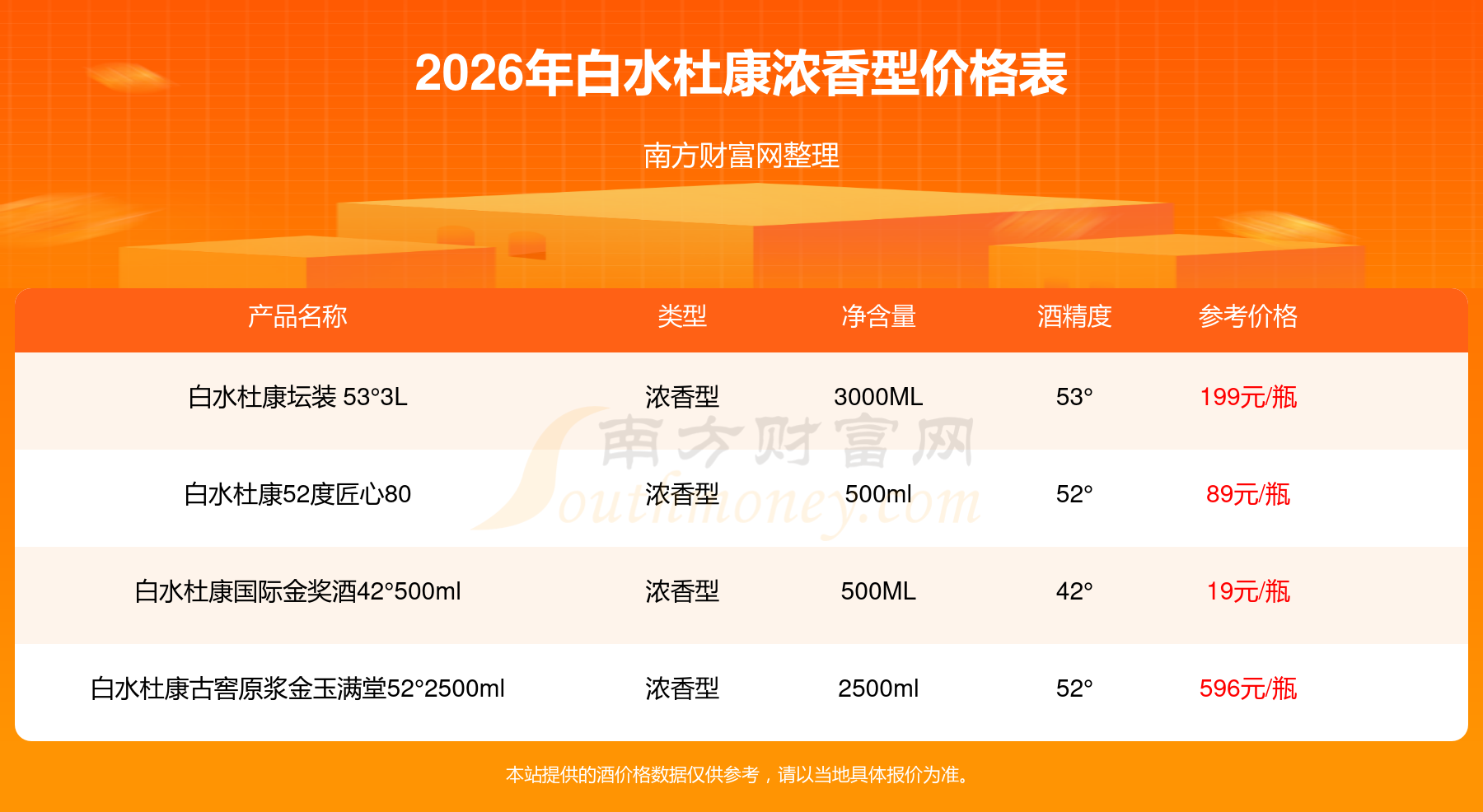 2026年,白水杜康浓香型酒价格最高的是白水杜康古窖原浆金玉满堂52°2500ml,参考价596元,最低的是白水杜康国际金奖酒42°500ml,参考价19元,价格高低差为577元。