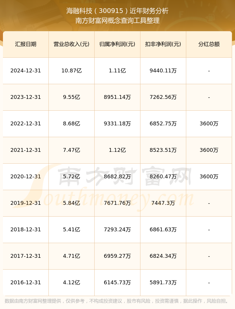 2024年报显示,海融科技实现营收10.87亿,同比增长13.89%;净利润1.11亿,同比增长23.78%;毛利率35.03%。