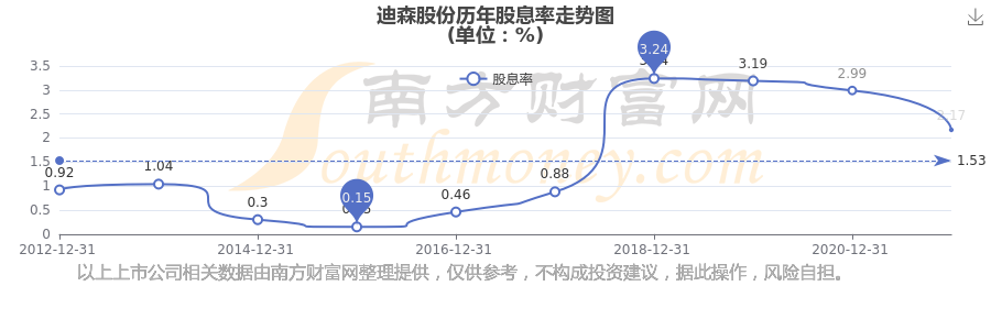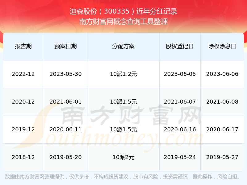 迪森股份最新一次公布的分红方案为10派1.2元。本次权益分派股权登记日为2023年6月5日,除权除息日为2023年6月6日,派息日为2023年6月6日。