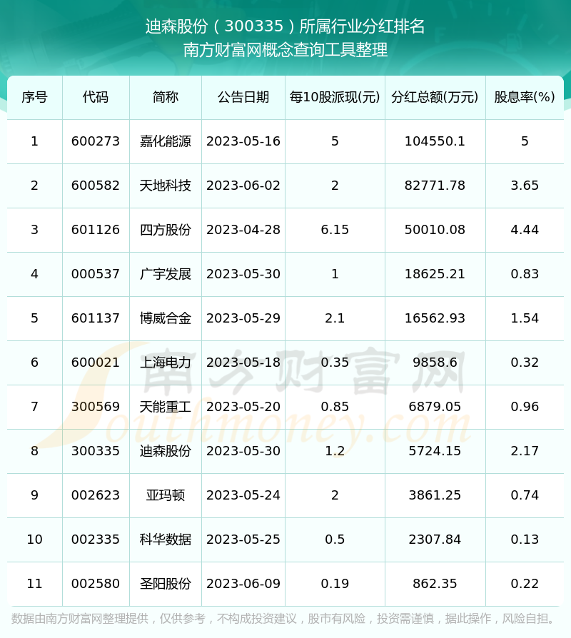 按照南方财富网趋势选股系统统计,迪森股份所属行业为新能源行业,新能源行业分红排名情况如下表: