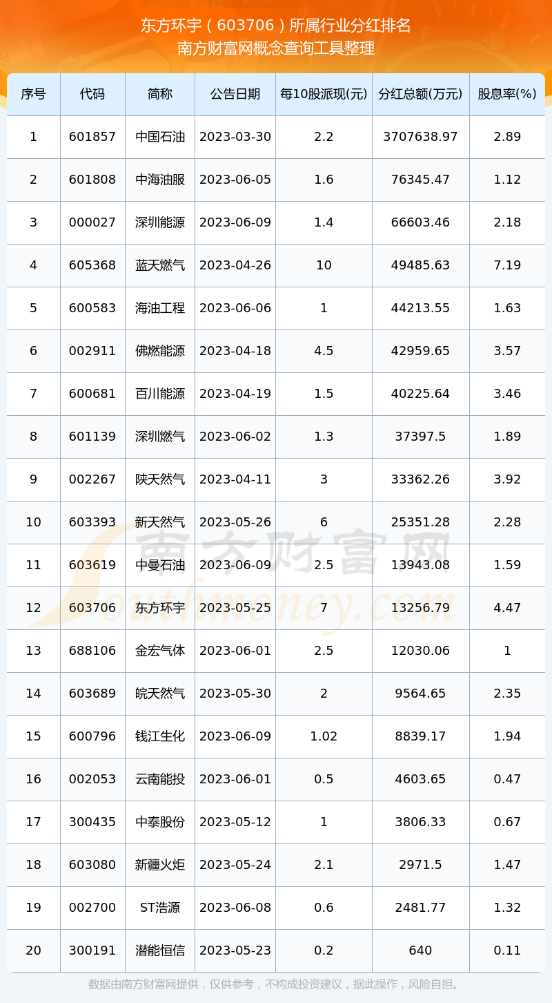 按照南方财富网趋势选股系统统计,东方环宇所属行业为天然气行业,天然气行业分红排名情况如下表: