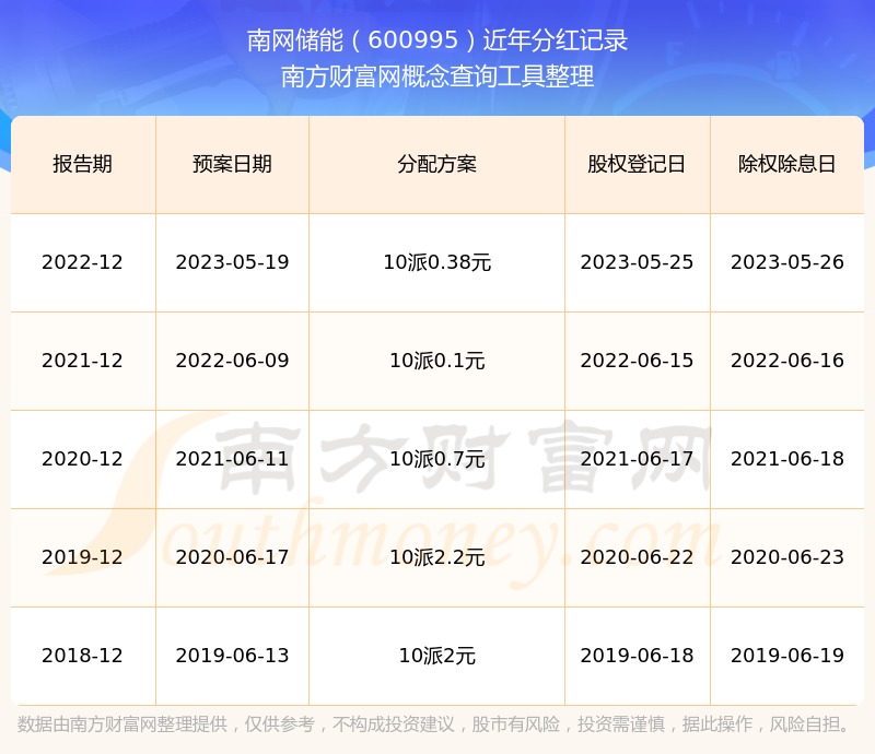 南网储能最新一次公布的分红方案为10派0.38元。本次权益分派股权登记日为2023年5月25日,除权除息日为2023年5月26日,派息日为2023年5月26日。