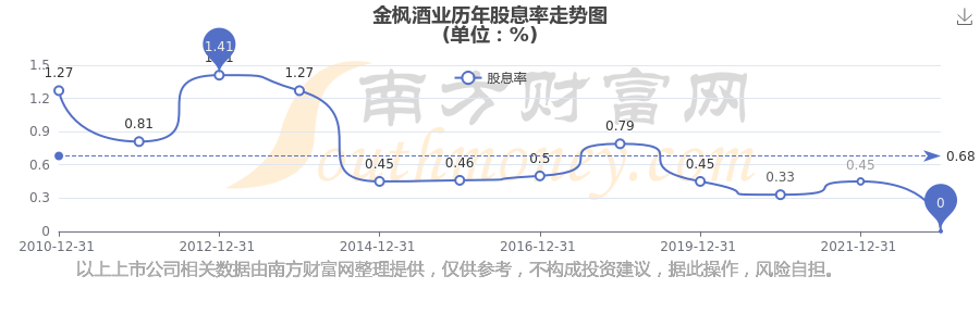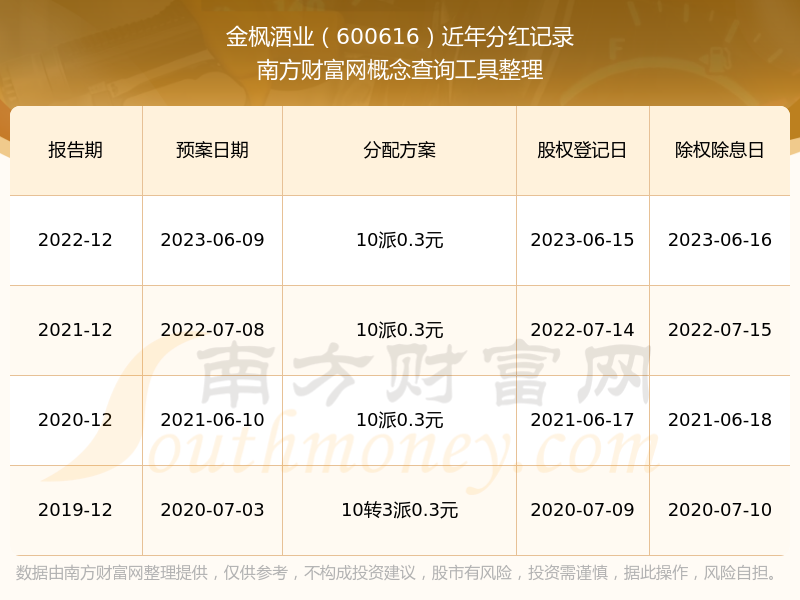 金枫酒业最新一次公布的分红方案为10派0.3元。本次权益分派股权登记日为2023年6月15日,除权除息日为2023年6月16日,派息日为2023年6月16日。