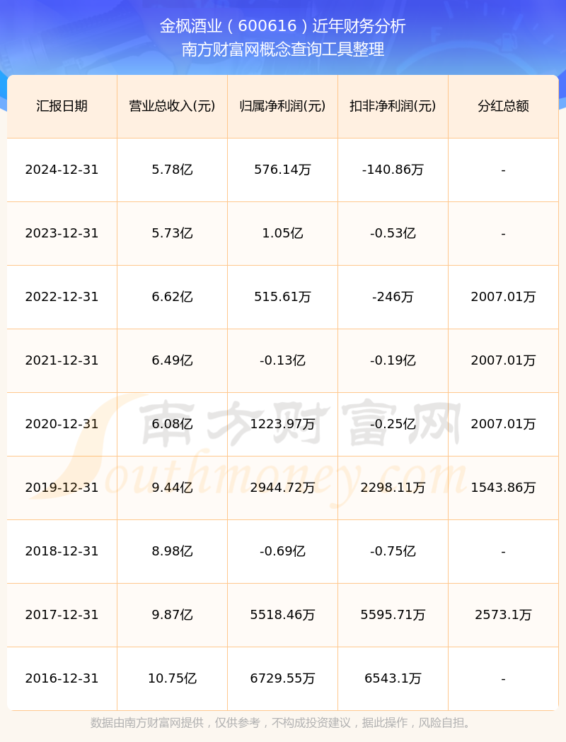 金枫酒业2024年总营收5.78亿,同比增长0.87%;净利润576.14万,同比增长-94.49%;销售毛利率42.03%。