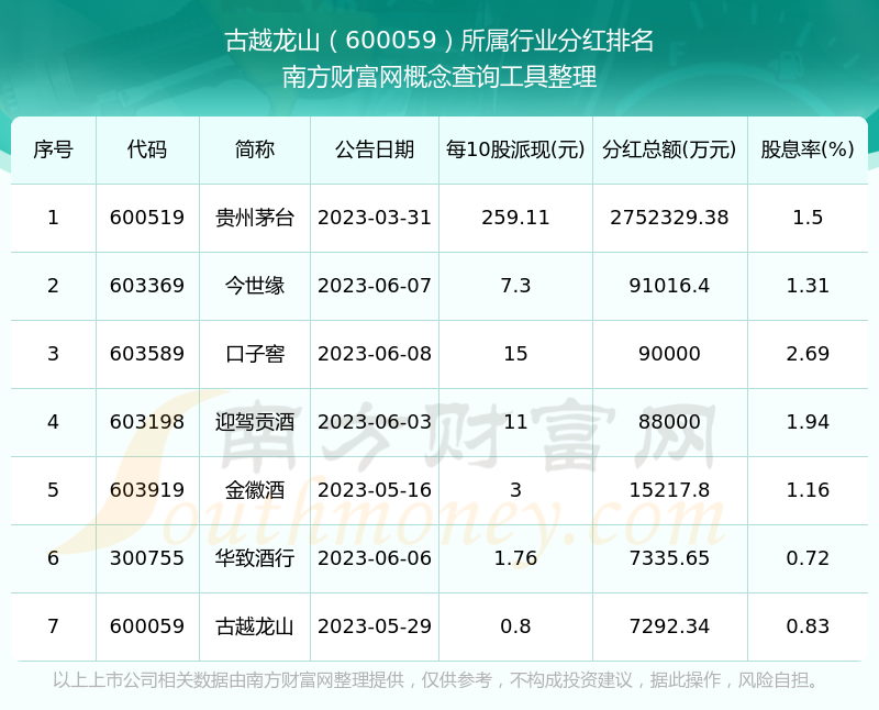 按照南方财富网趋势选股系统统计,古越龙山所属行业为酿酒行业行业,酿酒行业行业分红排名情况如下表: