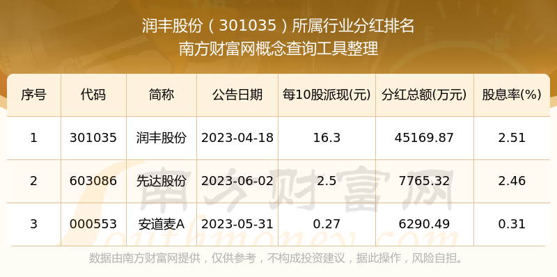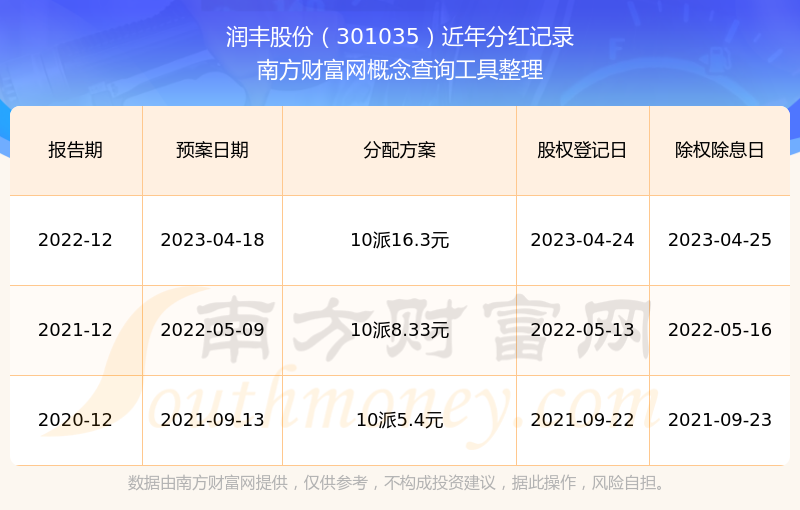 润丰股份最新一次公布的分红方案为10派16.3元。本次权益分派股权登记日为2023年4月24日,除权除息日为2023年4月25日,派息日为2023年4月25日。
