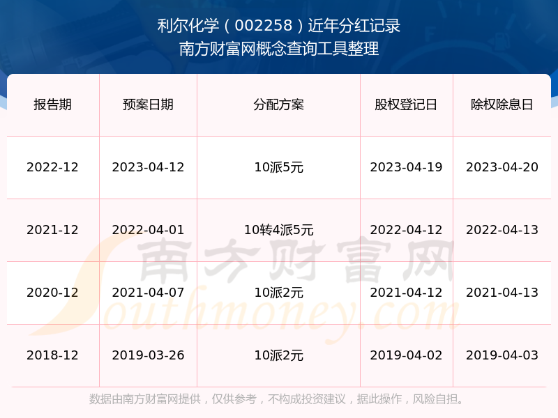 利尔化学最新一次公布的分红方案为10派5元。本次权益分派股权登记日为2023年4月19日,除权除息日为2023年4月20日,派息日为2023年4月20日。