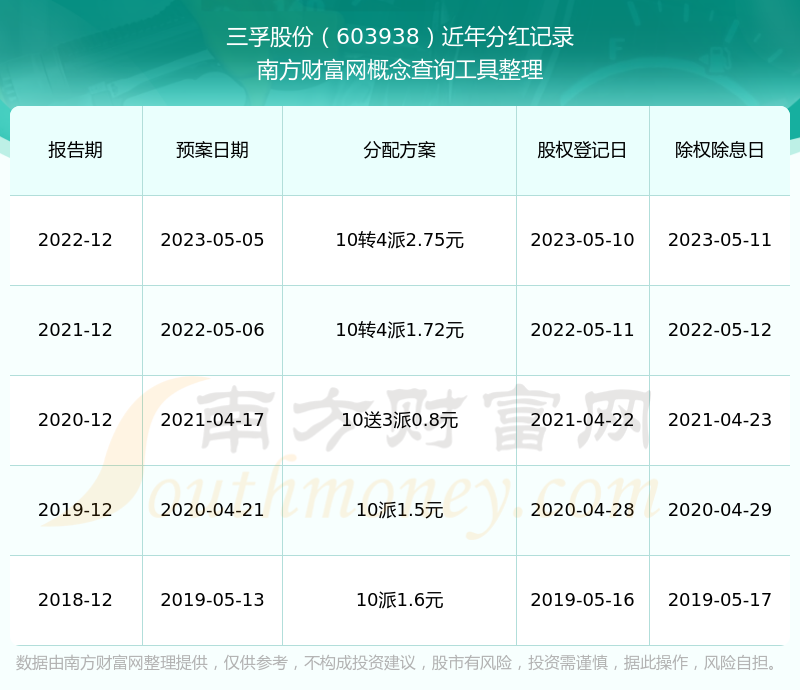 三孚股份最新一次公布的分红方案为10转4派2.75元。本次权益分派股权登记日为2023年5月10日,除权除息日为2023年5月11日,派息日为2023年5月11日。