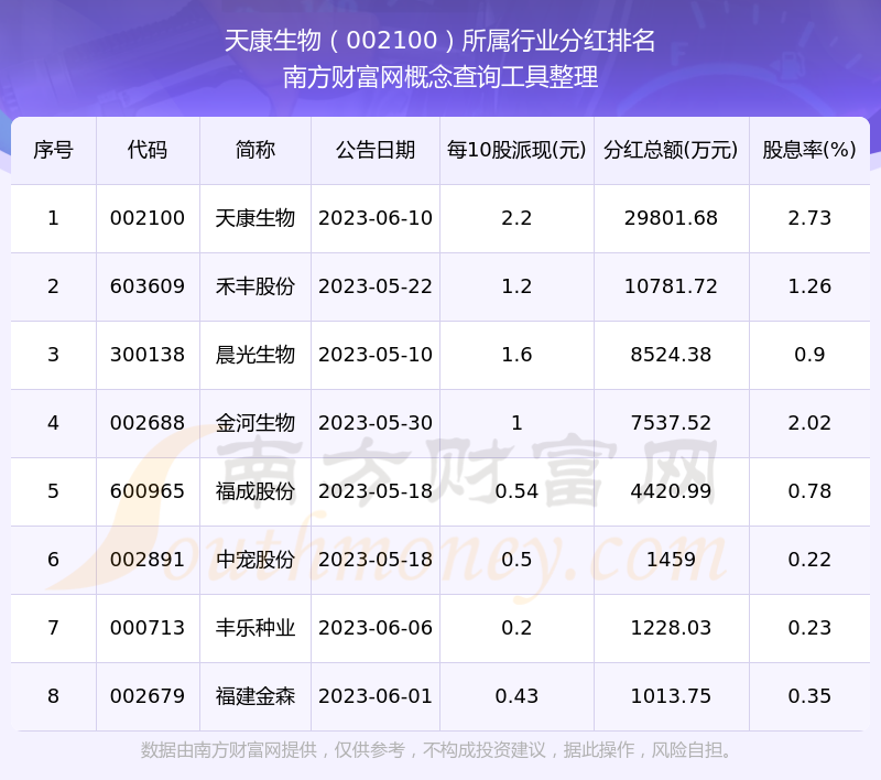 按照南方财富网趋势选股系统统计,天康生物所属行业为生物疫苗行业,生物疫苗行业分红排名情况如下表: