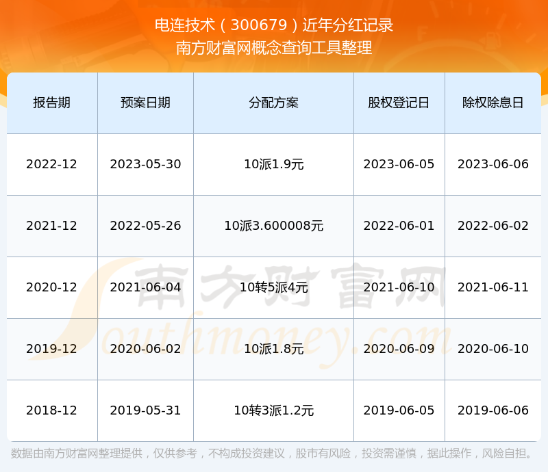 电连技术最新一次公布的分红方案为10派1.9元。本次权益分派股权登记日为2023年6月5日,除权除息日为2023年6月6日,派息日为2023年6月6日。