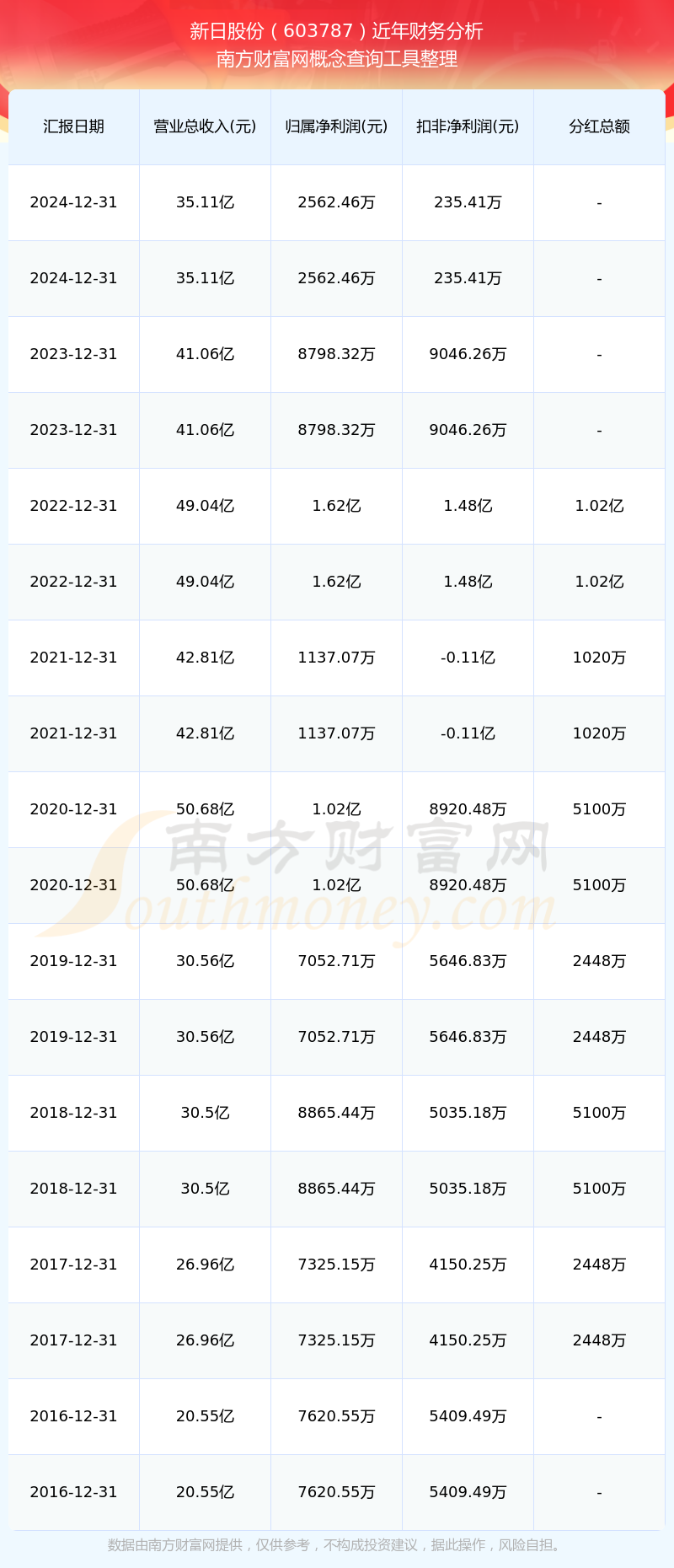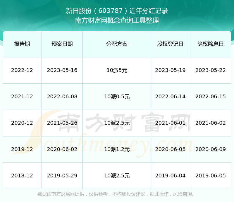新日股份最新一次公布的分红方案为10派5元。本次权益分派股权登记日为2023年5月19日,除权除息日为2023年5月22日,派息日为2023年5月22日。