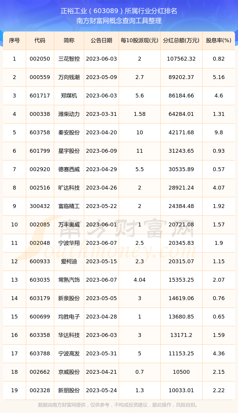 按照南方财富网趋势选股系统统计,正裕工业所属行业为汽车零部件行业,汽车零部件行业分红排名情况如下表: