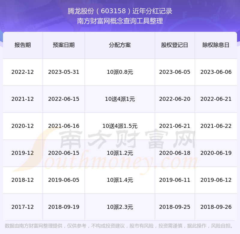 腾龙股份最新一次公布的分红方案为10派0.8元。本次权益分派股权登记日为2023年6月5日,除权除息日为2023年6月6日,派息日为2023年6月6日。