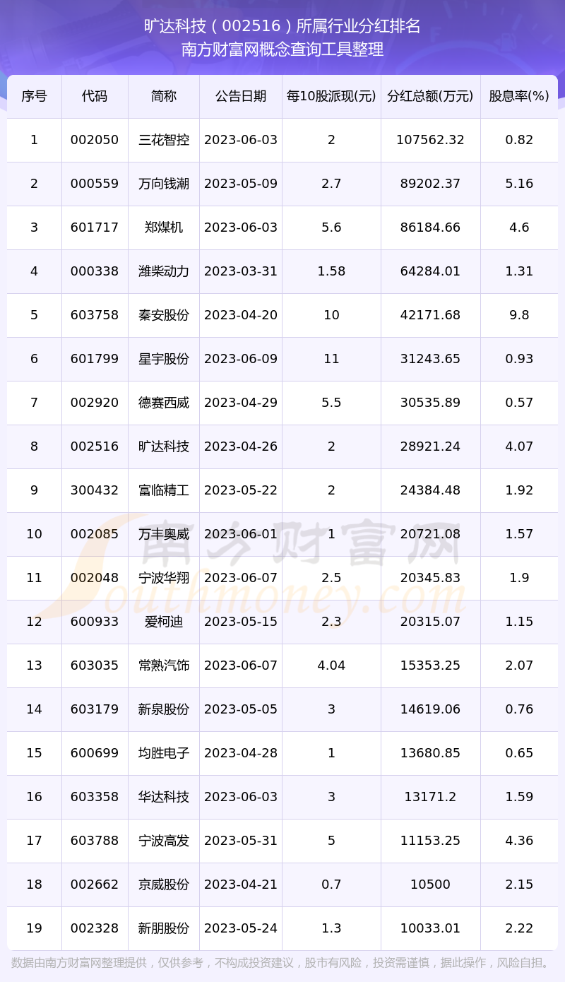 按照南方财富网趋势选股系统统计,旷达科技所属行业为合成革行业,合成革行业分红排名情况如下表: