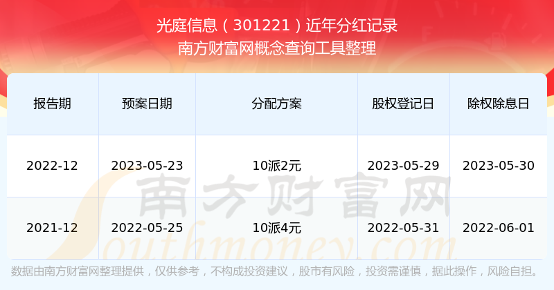光庭信息最新一次公布的分红方案为10派2元。本次权益分派股权登记日为2023年5月29日,除权除息日为2023年5月30日,派息日为2023年5月30日。