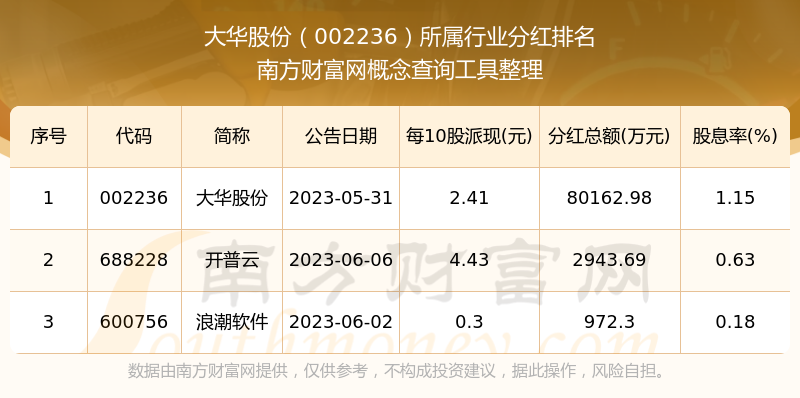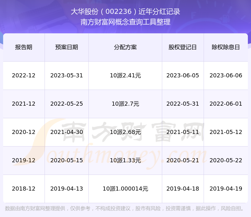 大华股份最新一次公布的分红方案为10派2.41元。本次权益分派股权登记日为2023年6月5日,除权除息日为2023年6月6日,派息日为2023年6月6日。